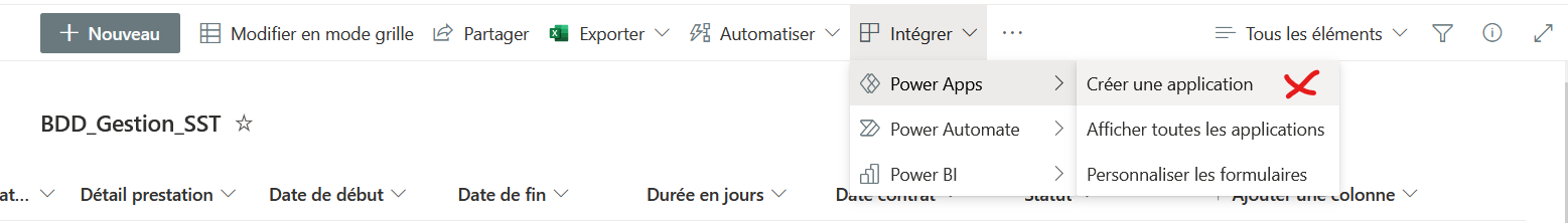 Vous pouvez directement créer une application basée sur votre liste Sharepoint depuis Sharepoint. Pour ce faire, rendez-vous sur la liste Sharepoint qui vous intéresse et cliquez sur « Intégreré » puis « Power Apps » et enfin » Créer une application » :