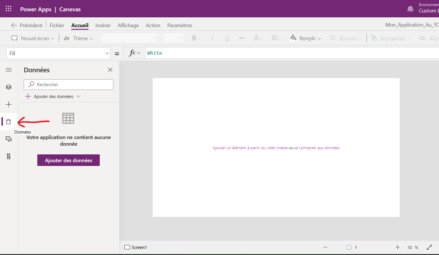 Vous allez être redirigé vers l’écran de conception de votre application qui est comparable visuellement à Power Point (un rectangle blanc au milieu). Pour connecter vos listes Sharepoint à votre nouvelle application, rendez-vous dans le menu « Données » sur le menu de gauche :